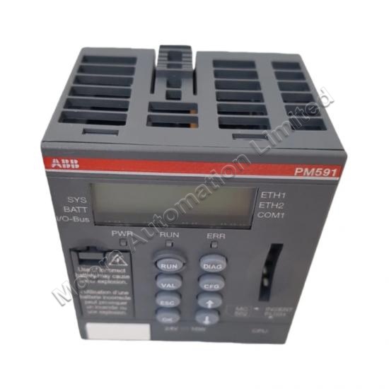The ABB PM591 operates at a rated voltage of 24 V DC with a supply range from 20.4 V DC to 28.8 V DC.
